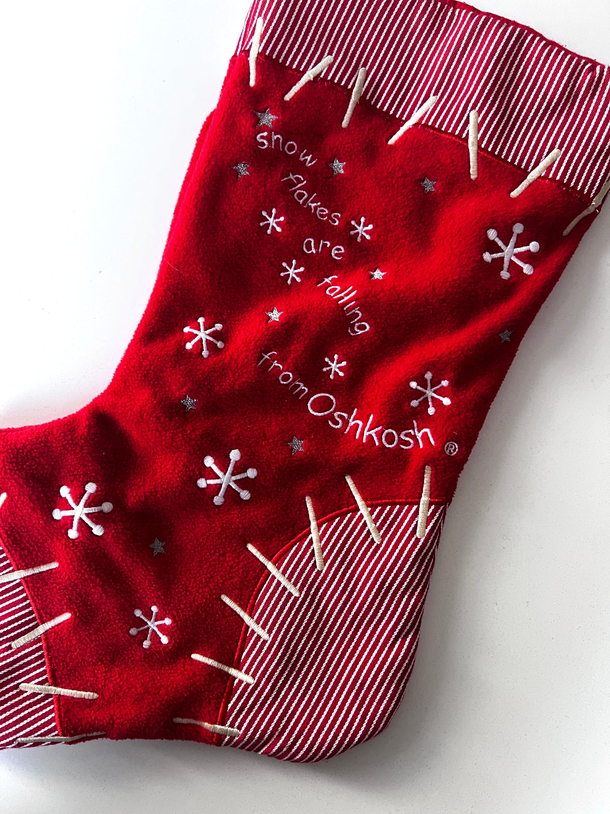 Amazing, vintage Osh Kosh stocking. Super rare :) Made from cosy fleece and trimmed with classic hickory stripe denim, one to bring out every year.